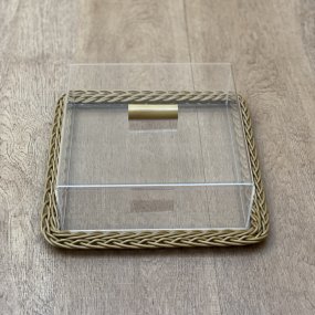Base em acrílico transparente com vime sintético verde e tampa em acrílico transparente.