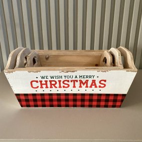 Trenó rena decorativo em rattan com laço xadrez vermelho e preto e arranjo folhas, frutas vermelhas e pinhas